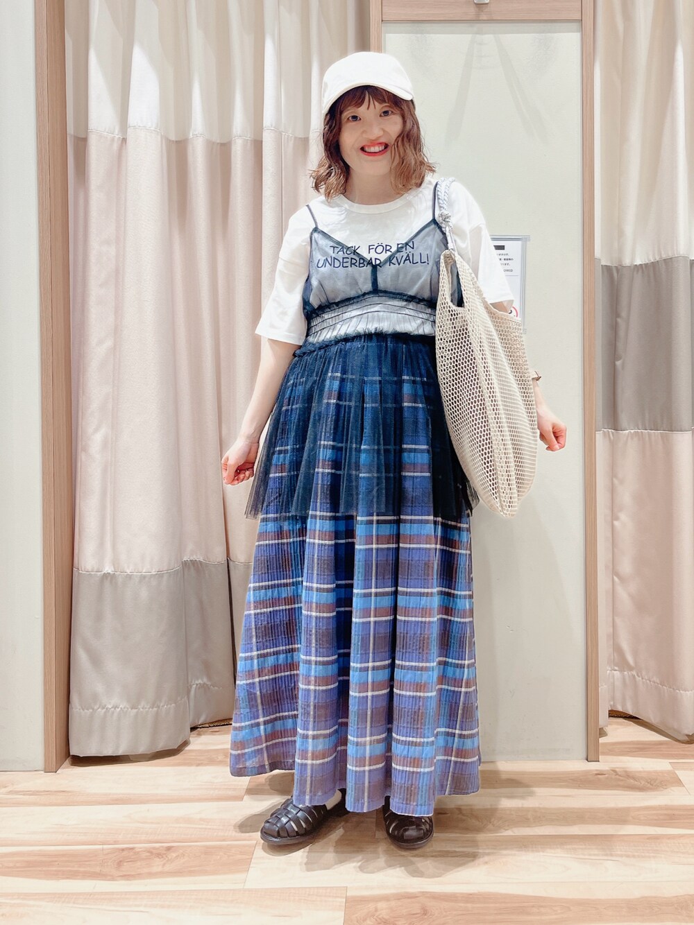 おはようございます☀︎ いつもご覧頂きありがとうございます😊 チュールとチェックスカートで カジュアルコーデ🐬 Tシャツのロゴの色に合わせて スカートはブルー系にして爽やかにしました♪ ※産休中のためお店には出勤しておりません。