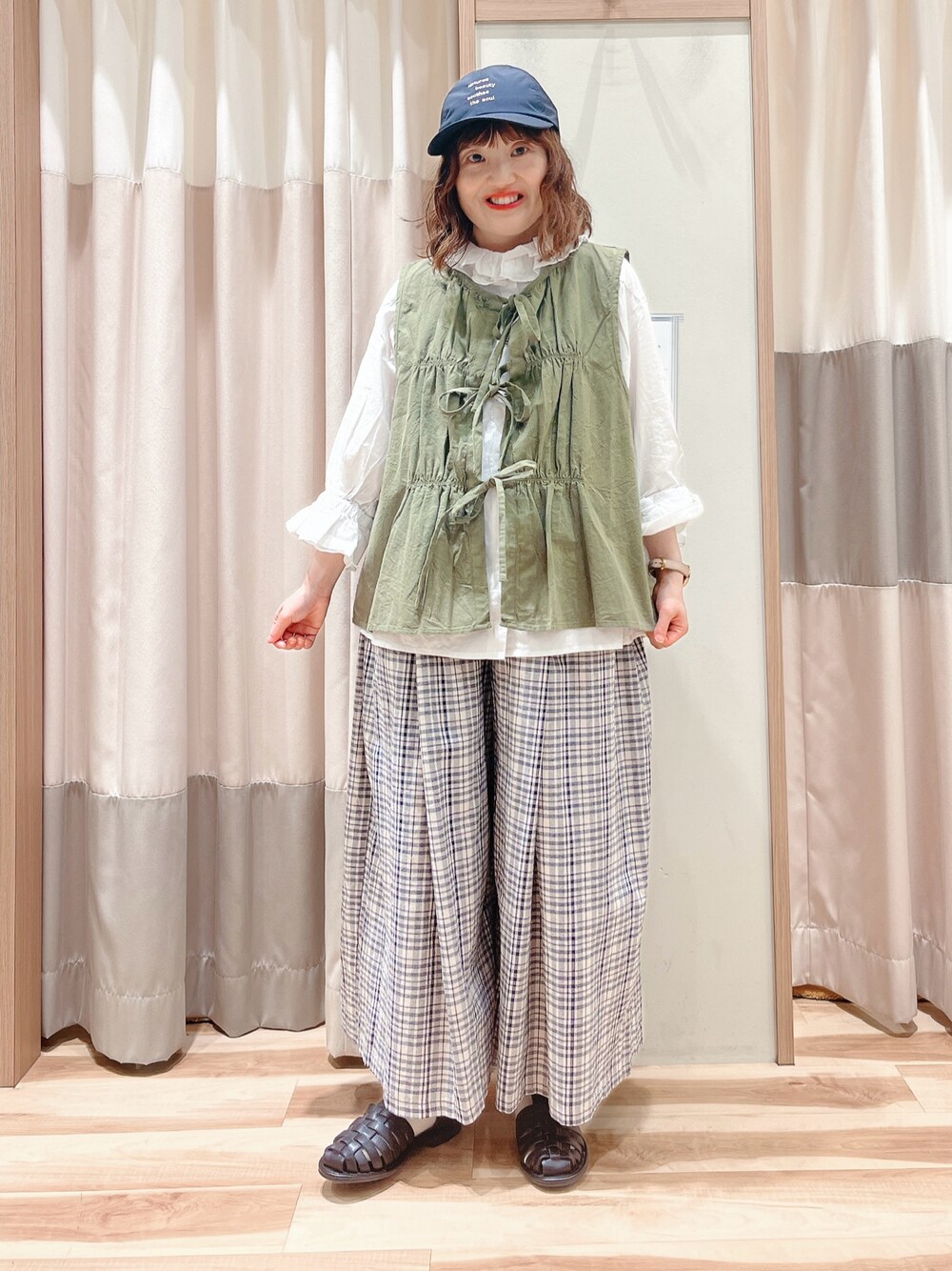 おはようございます☀︎ いつもご覧頂きありがとうございます😊 ブラウス色違いコーデ ベストと合わせてカジュアルコーデ🐨 ブラウスはフリルカラーがポイントです♫ フリルが可愛いのでシンプルなベストと合わせて 甘さを抑えてみました🫰🏻 チェック柄のワイドパンツと合わせて メリハリをつけました✨ ※産休中のためお店には出勤しておりません。