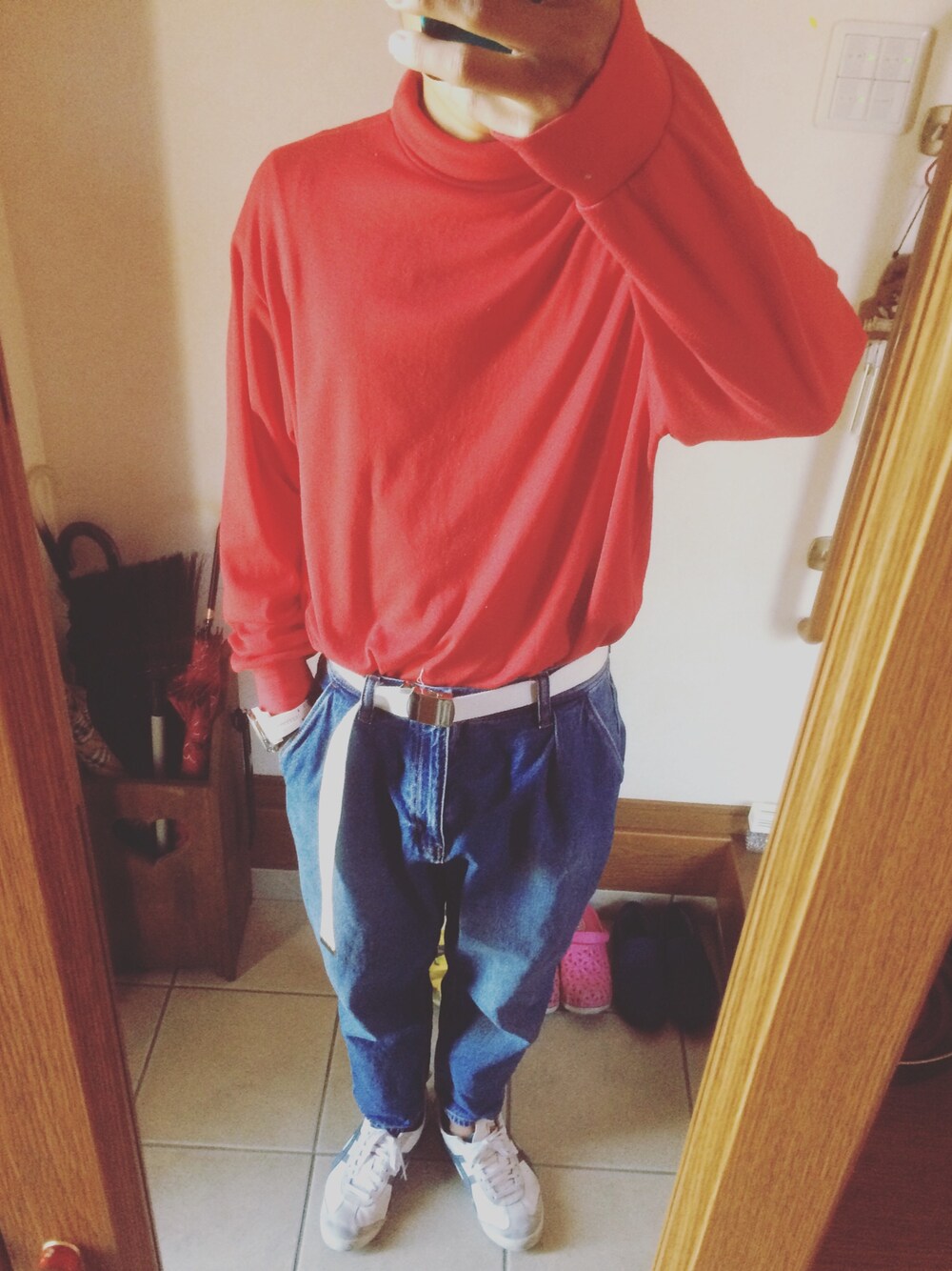 この赤いのんを着たくて、GUのパンツと合わせてみて、お、ええやんってなって、タックインしてみて、完成です。
