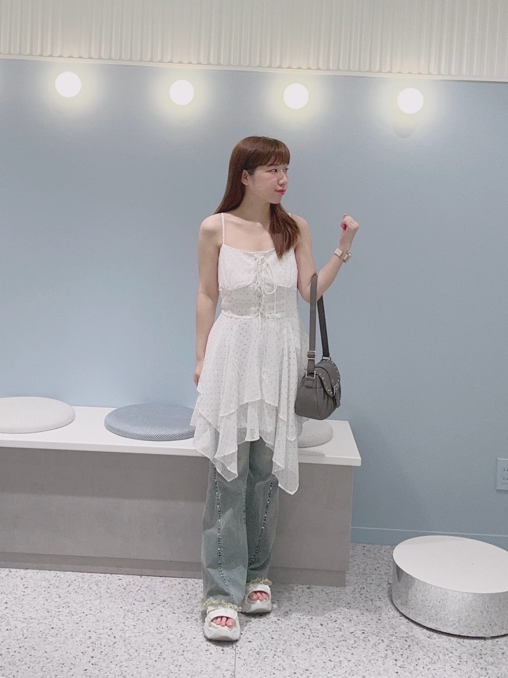 chinami(OLIVE des OLIVE HEP FIVE)のデニムパンツ「【美シルエット/着痩せ】スタッズ付きストレッチデニムパンツ」を使ったコーディネート