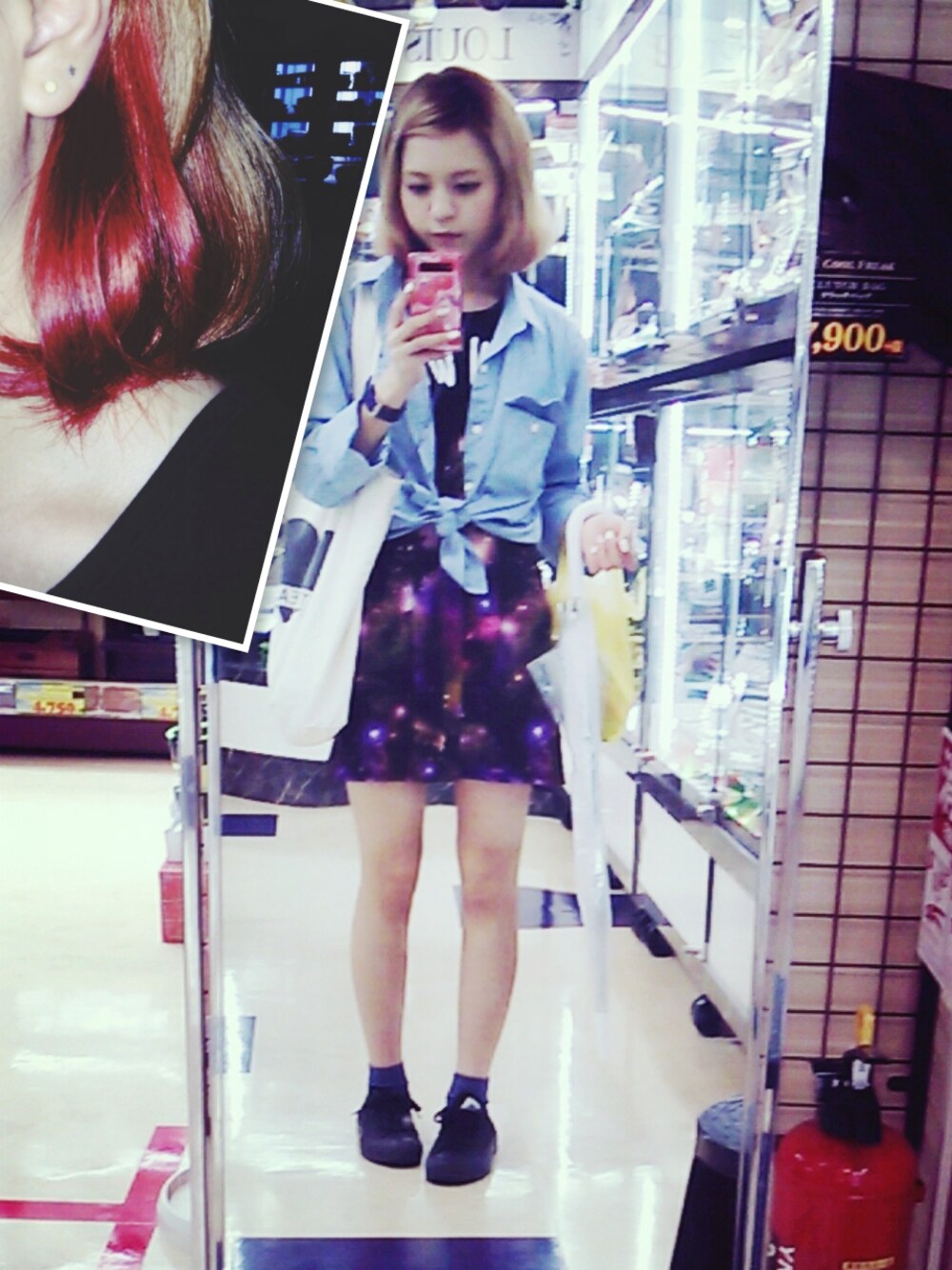 この日はなんか7時前に目が覚めたから 半分だけカラートリートメントで赤くしてから バイトの準備した♡ 髪の毛ちょっと段なってるから いい感じに赤が見えて グラデーションぽくなったの╭( ・ᄇ・)و 久しぶりにギャラクシー柄着た もうすぐ夏だしギャラクシー増やしたいな✡