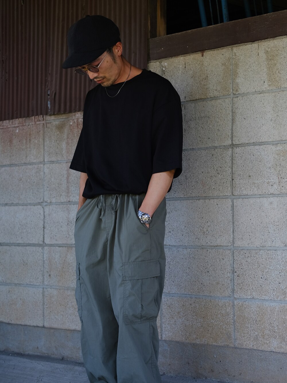 ブラック系のTシャツ/カットソーを着用したメンズの夏コーディネートの2枚目の写真