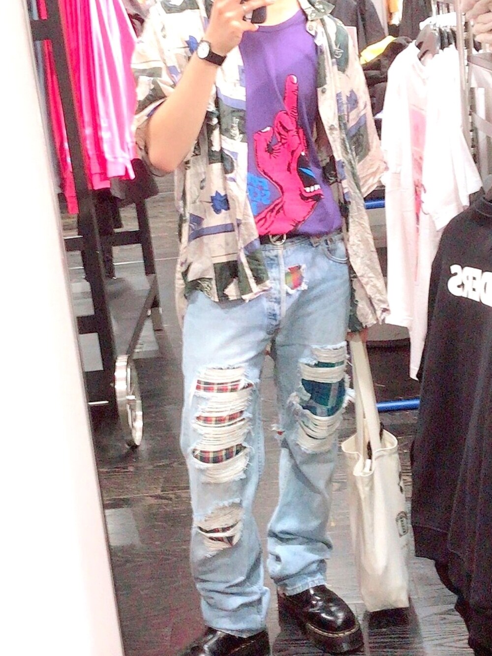夏コーデ 全部古着です 名古屋に住んでで、大須で全部買ってます 中はタンクトップで、風でシャツがなびいてたまに肌が見えるのがセクシーだそうです 笑