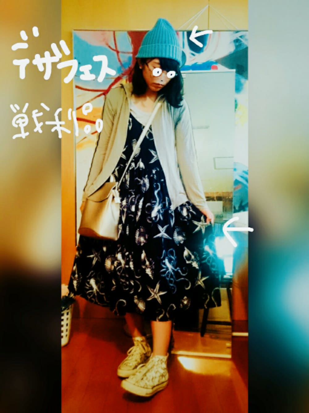 お久し振りです。 デザフェスにこの前行ってきまして。 いろいろ買ったので戦利品をご紹介。 まずこの水色のニット帽! こやつはデニムとかによくあるインディゴ染めなんだそうですよ。 色の深いものから浅いものまでいろいろありましたが、水色っぽいの欲しかったのでそれを買いました。 独特の風合いというか、かすれたようなテクスチャー感があってよい感じです。 お次はこのちょいグロマリンなワンピース。 貝殻やヒトデ、タコなどのマリンなモチーフが図鑑のようなタッチで描かれています。 いいなーと思ってこの服を眺めていると、店員さんに声をかけられ。振り向くとまさかの大学の友人でした。 話を聞くと、そのブランドの服にプリントしてある柄のイラストをすべて描いてるんだとか。 全体的にグロテスクな雰囲気のイラストで、いわゆる「KERA」系の子に人気があるみたい。 でもTシャツやワンピースなど形もいろいろあって、結構いろんなファッションにあわせやすそうな雰囲気! 目玉&お花柄か、このちょいグロマリン柄か迷ってこちらを買いました。 こんな素敵なものを友人がデザインしているなんて、勝手ながら誇らしい気持ちになっていろんな人に自慢してしまいました。 たくさんのおしゃれな人や、雑誌のモデルさんが、友人のデザインした服を着ている!! ほんとすごいな、かっこいい。 あ、 また詳細告知用にコーデをアップする予定ですが、ちょろっと先にご報告。 来月の7/15(土)に、豊島区でフリマ開催します! 気になる主店者は、 ・ご存知WEARISTA「ケントさん」 ・にらめっこ仲間の「まなとさん」 ・ジャミーメロー(バンド)「めみくりーむさん」 ・オリジナルブランド"0" (らぶ)「おみつさん」 ・音羽画廊「梶浦さん」 ・舞台女優「みなみなみさん」(出品のみ、本人は来ません) その他、美大卒や現役デザイナー、アーティスト等。 あと私もなにかしら出します。 ★向原アーテコマーケット 日時→7/15(土)11時~17時 場所→日の出ファクトリー(都電荒川線向原駅より徒歩1分、池袋駅より徒歩15分) よろしくです。