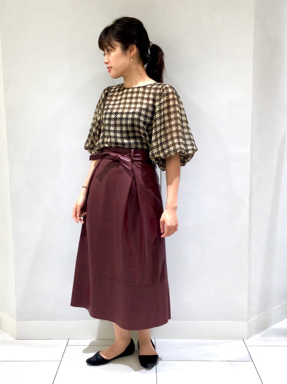シャツ品番 10-02-02-004 スカート品番 30-02-09-610 控えめなハンドトゥース柄に合皮でトレンド感と遊びを入れてみました。