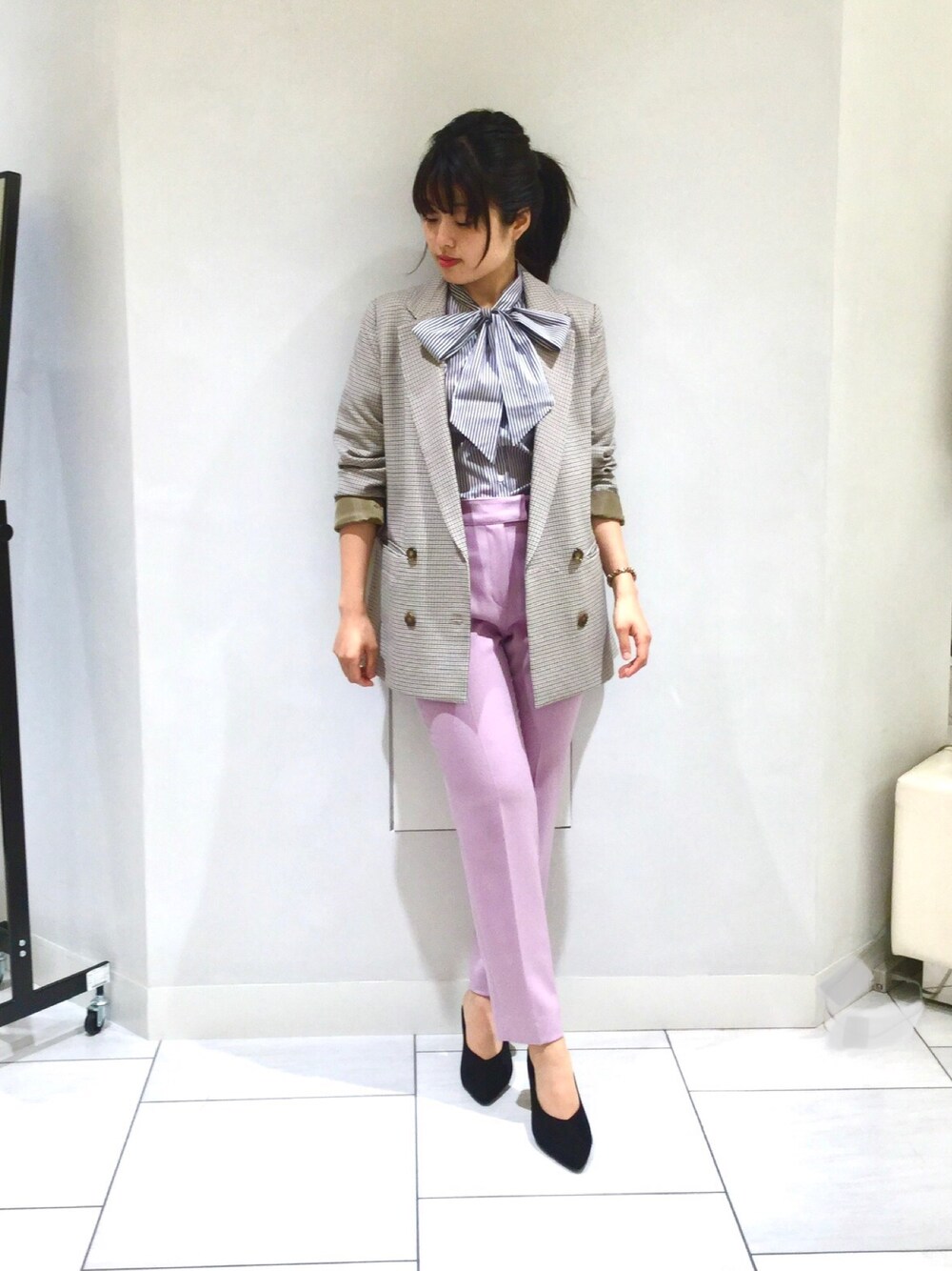 シャツ品番 10-02-01-204 ジャケット品番 30-02-21-611 パンツ品番 30-02-09-607 難しい柄×柄合わせも同系色ならトライしやすいです。 トラッドな印象の柄もピンクで女性らしい印象に。
