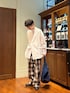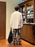 デニム生地のチェックパンツ 職人が手作業でブロックごとに脱色しているため独特の風合いがあります。