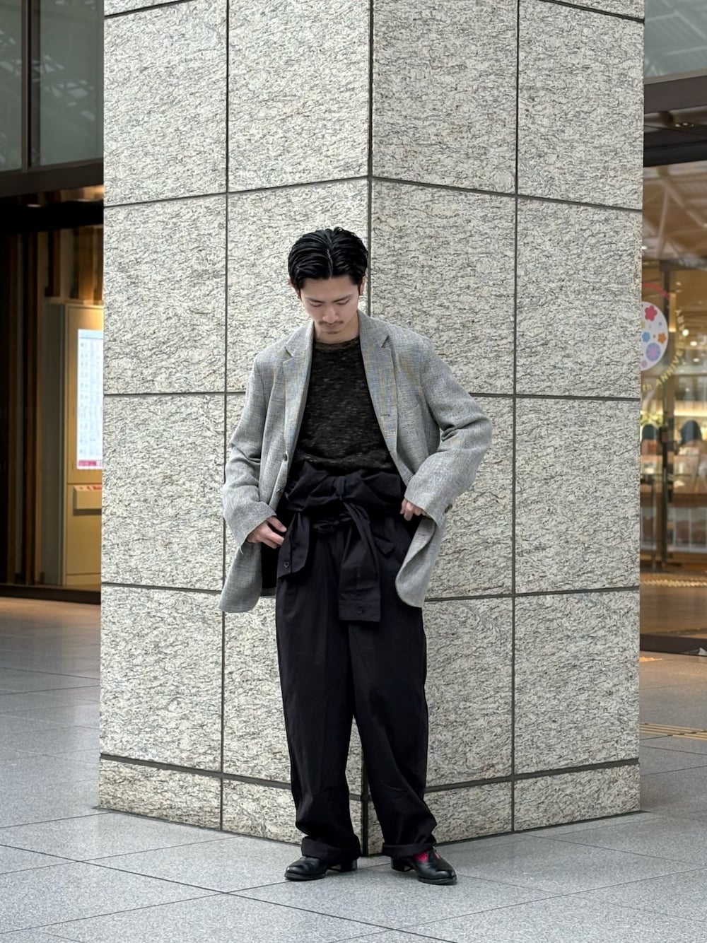 今期のイーレ店の中でも最推しジャケットが入荷しました。 5ボタンの重厚感のある見た目、に反して透け感のある軽やかで柔らかな素材です。 正直実物を見ないと良さが100%伝わるとは思えないです。それくらい実物が完璧です。 合わせるのはseeallのジャンプスーツ。ベルトループもあるのでベルトを付けてセットアップ風に着用してもかっこよさそうです。