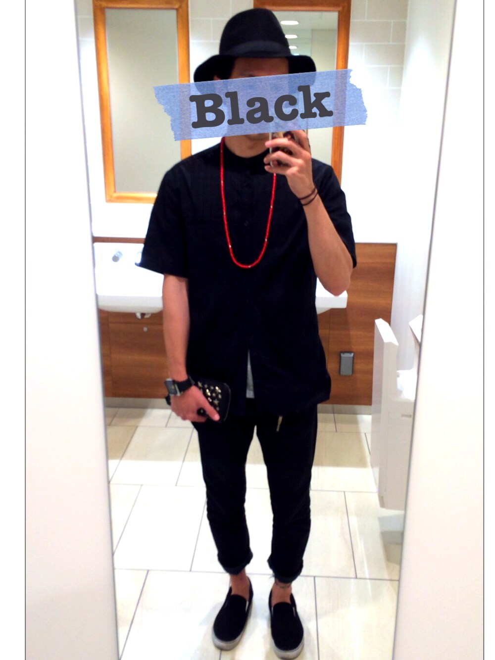 全身黒一色のワントーンです! まっくろくろすけコーデ! 黒×赤っていうのが好きなんでビーズネックレスは赤♪
