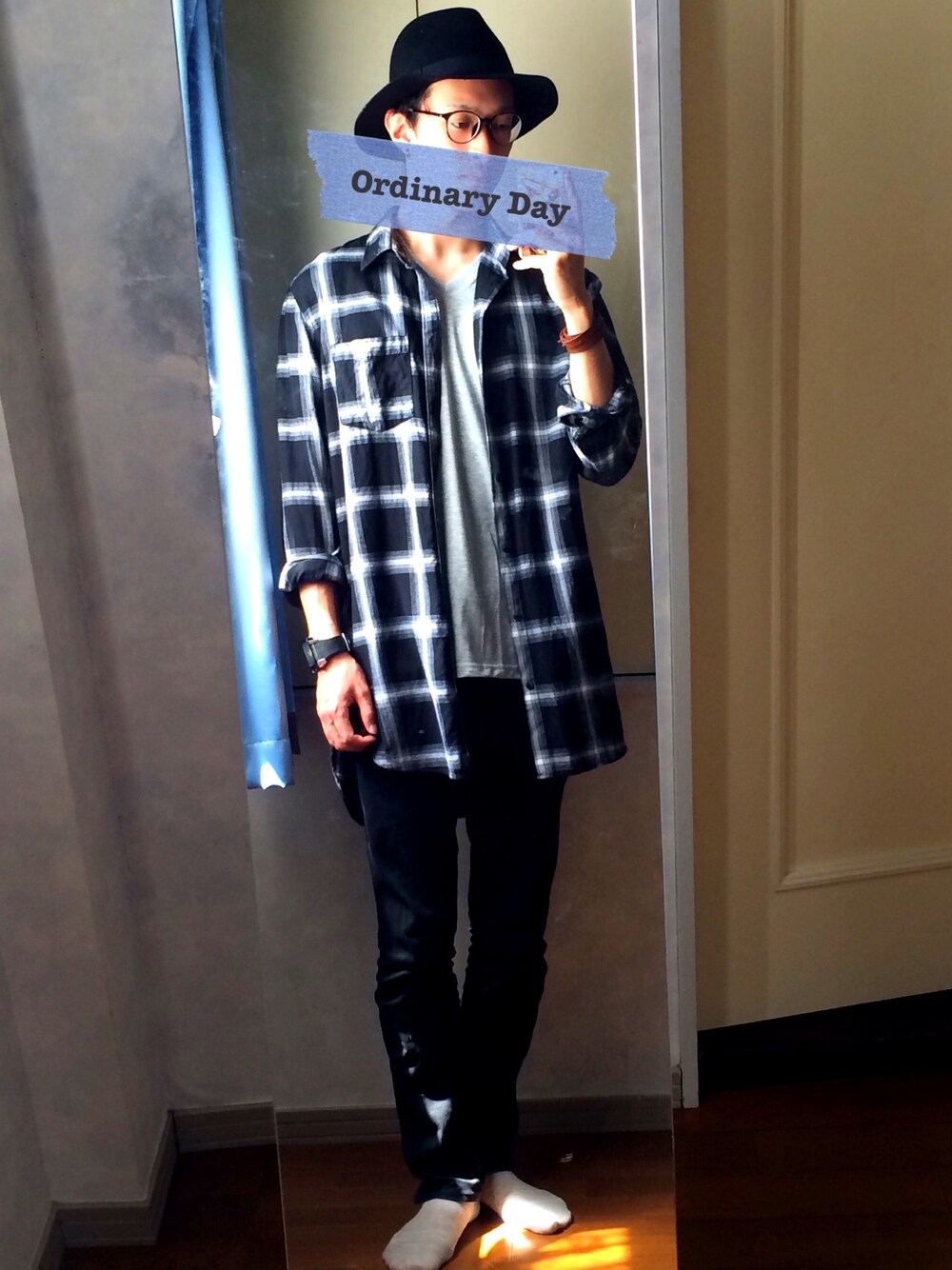 今日は午前中にホームセンター行く以外に特段予定がないのでラフに! ロングシャツ×スキニー×ハット×メガネ 帰宅したらシャツを脱ぎ捨てTシャツ姿でゴロゴロすることでしょう(笑)