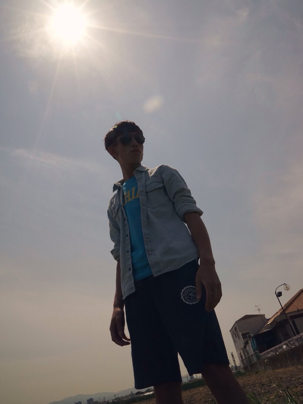 ブルー系のTシャツ/カットソーを着用したメンズの春コーディネートの1枚目の写真