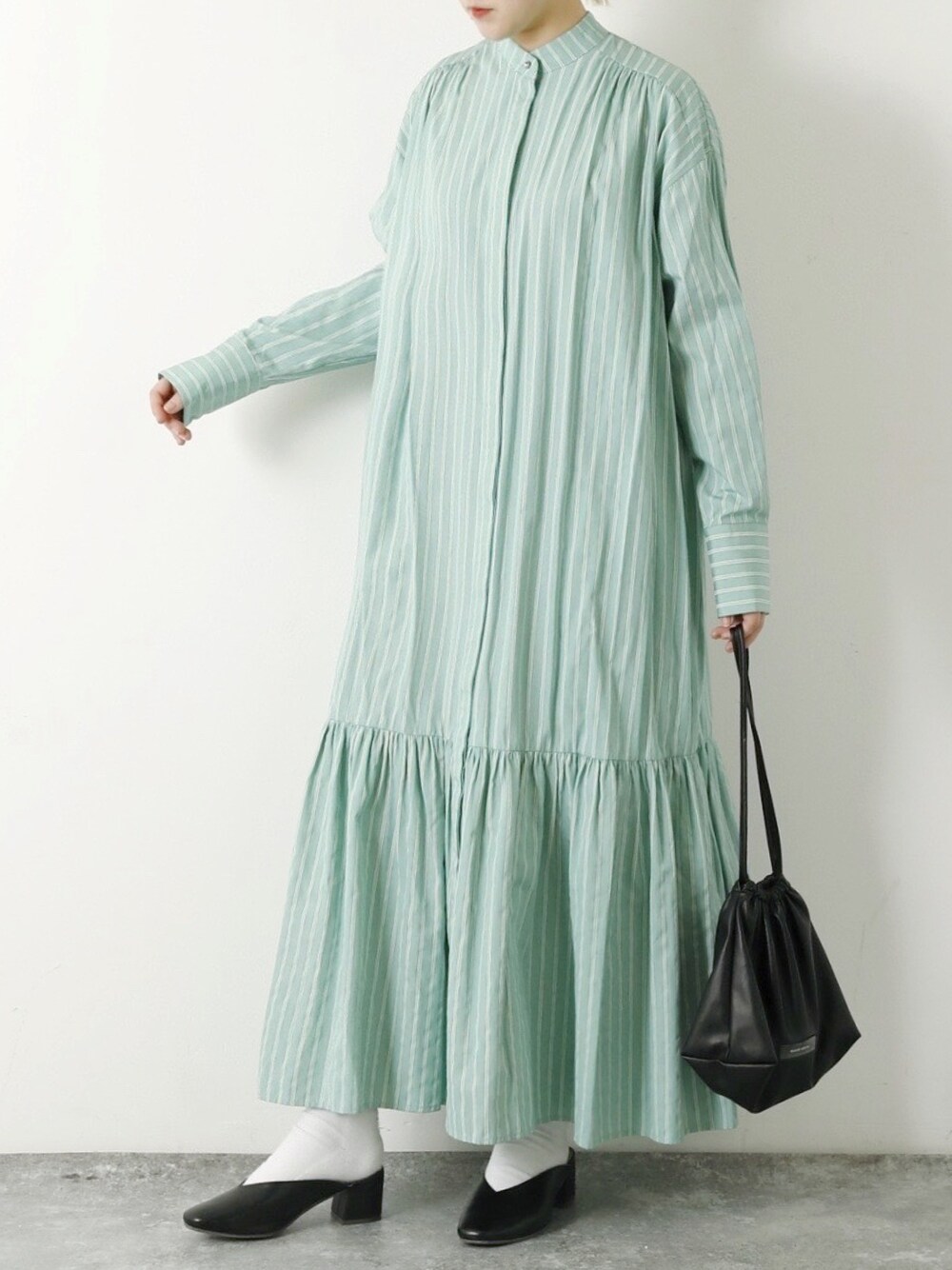 ariのシャツワンピース「【forksy.】シャドーストライプ裾ティアード切り替えシャツワンピース」を使ったコーディネート