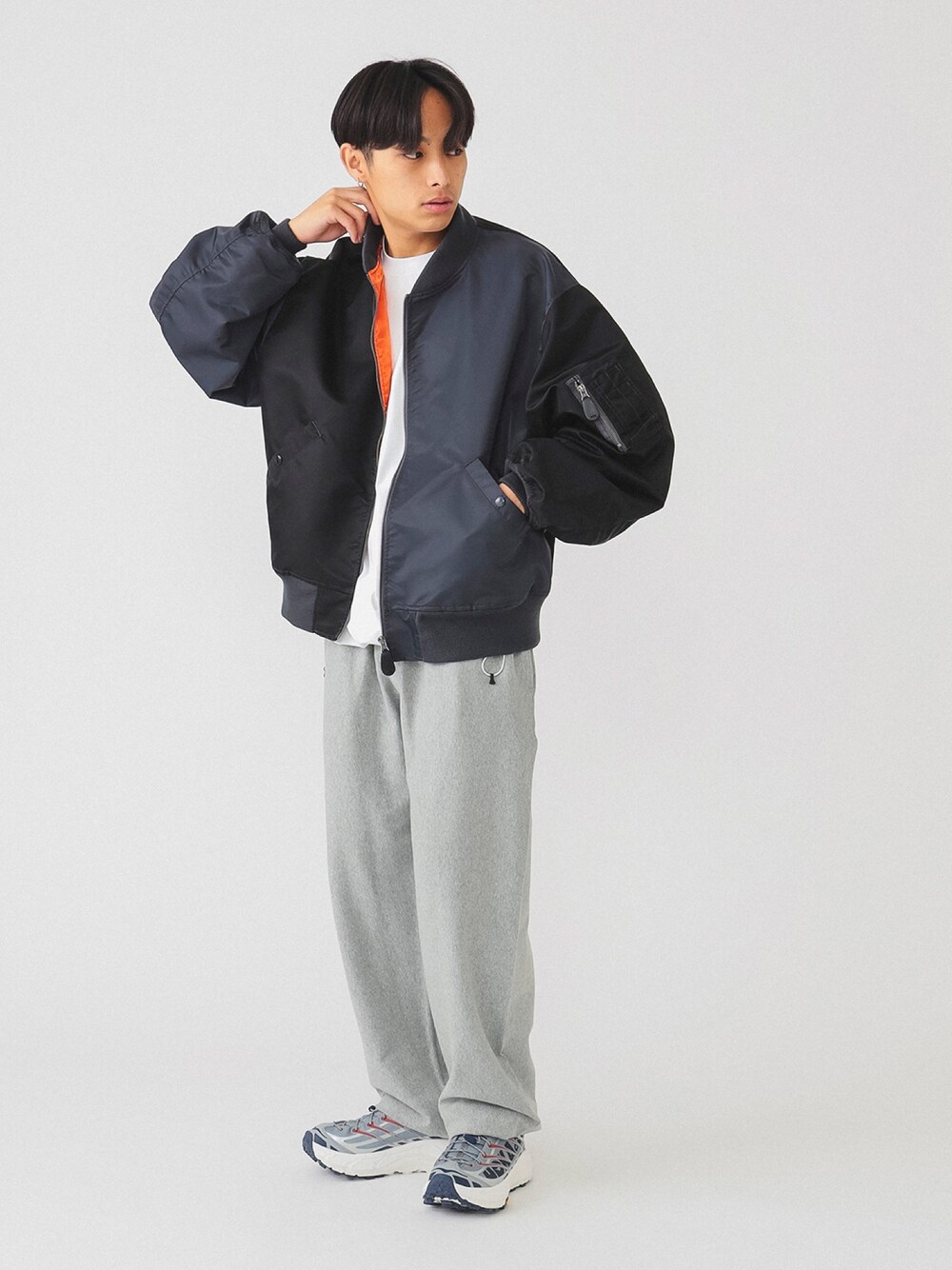 クリーンな配色🧼 ミリタリーアイテムにはスウェットパンツを合わせて柔らかな印象に!