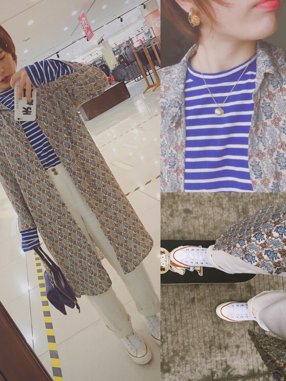 蓝白色系/横条纹的T外披一件蓝色印花衬衫,因为T的蓝色饱和度比较高,所以内搭会比较出跳,也不会使印花和条纹的混搭显得杂乱。为了看着清爽,所以选择白色裤子和converse。因为蓝色包包手提部分是金属链子,所以耳饰和项链我统一选择了金属系,全身呼应。