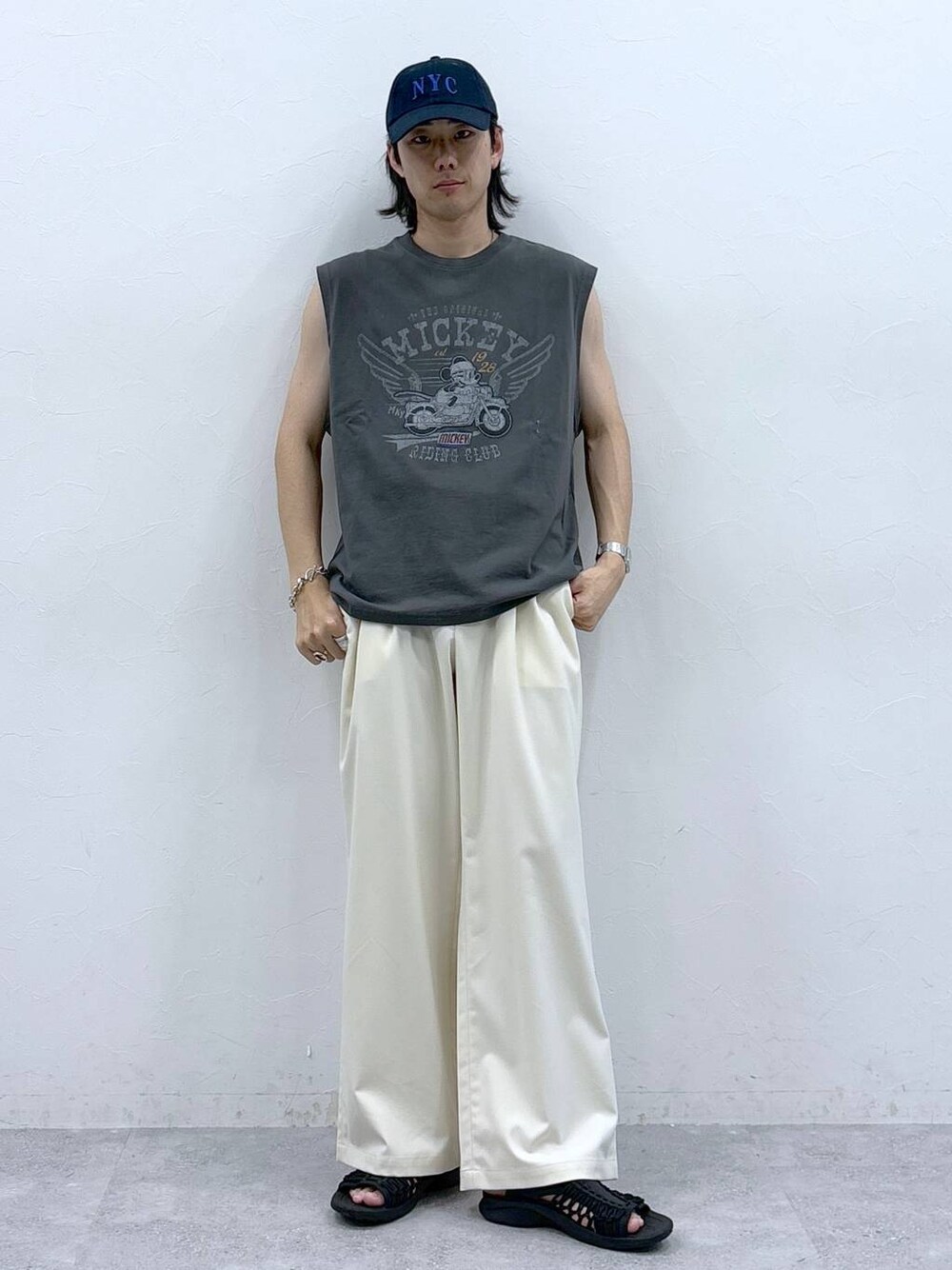 Instagram: モデル:175cm 59kg 細身肩幅大きめ ◉WEB限定キャラノースリ サイズ:L WEBでしか買えない限定のノースリーブが登場。 フロントやバックに施されたキャラクターが目を引く、一枚でサマになるアイテムです。ヴィンテージ感のある加工を施した、古着のような風合いを楽しめる素材で仕上げました。身幅や丈を大きくとったオーバーサイズで仕上げ、トレンド感のあるサイズ感に。アームホールを広くとることで、よりラフな印象をプラスし、夏でも快適に着用可能。 ◉サマーTRワイドパンツ サイズ:L もも回りから裾にかけてストンと落ちるワイドストレートシルエット。RAGEBLUE大人気の「TR生地」を使用した一本です。程よいハリ感やドレープ感が出ることでより上品で高級な生地感に。風通しもよく夏でも快適にご着用いただけます。ストレッチ性/伸縮性にも優れており、ノンストレスな着心地です。