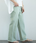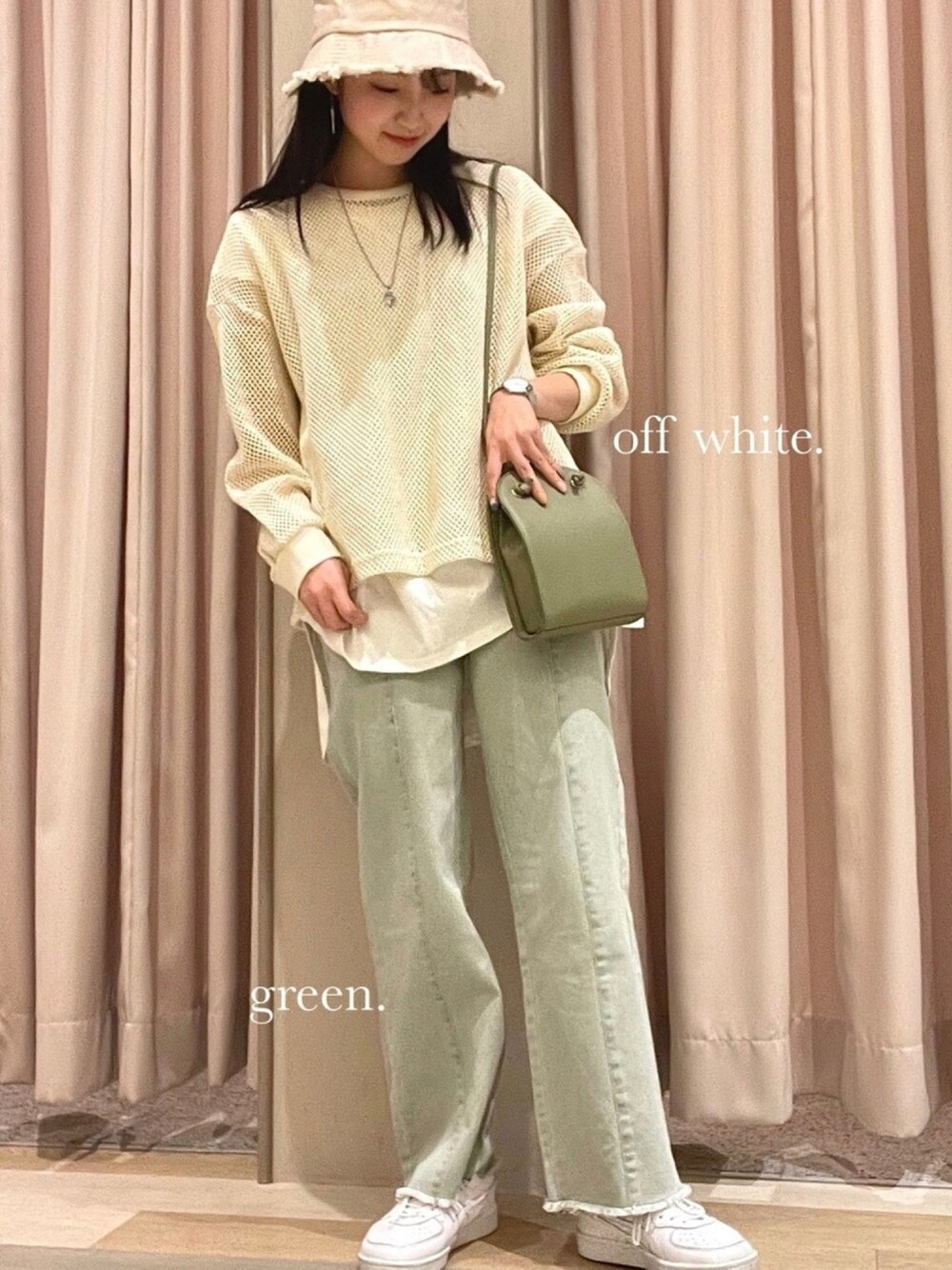 アイボリーとミントで統一したコーディネート💚 トップスは2点セットになっているので組み合わせを変えても使えるので万能です! メッシュはオシャレ感とトレンド感が増しますね𓈒𓂂𓏸 カラーパンツで一気に春らしく🌷 裾のフリンジがアクセントに! センターシームがあることでスタイルアップ効果があってスニーカーと合わせても綺麗に見えます◎