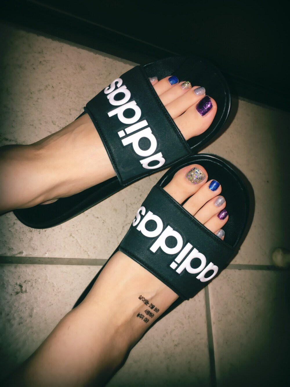 シャワーサンダルに合わせてフットネイルも派手目に変えてみました💓 MODIの大きめのラメ入りはヘビロテです✨