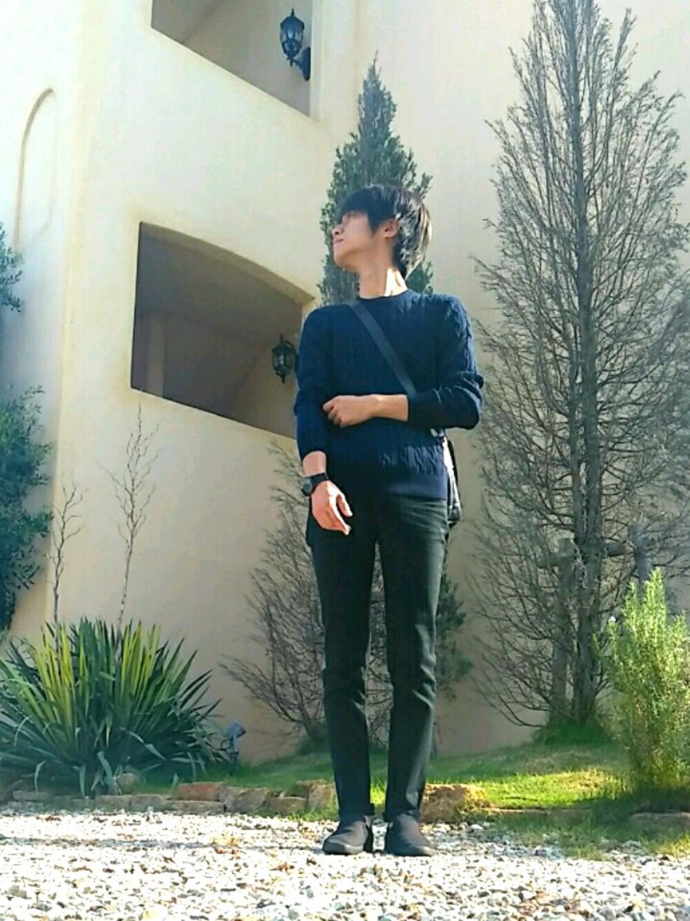 ダフネブルーのニット/セーター「MEN コットンカシミヤケーブルクルーネックセーター(長袖)」を使ったコーディネート