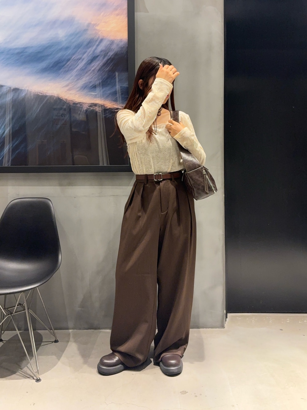 【tops】着用サイズ:FREE 繊細なメッシュに立体感のあるフロッキープリントを施した、着映え力のある一枚です! スクエアネックとクルーネックの前後2WAY仕様で、気分やスタイルに合わせて着まわせます✊🏻 程よい透け感が女性らしさを引き立てつつ、伸縮性のある素材で着心地も快適◎ インナー使いはもちろん、1枚でさらっと着ても主役級の存在感を放ちます𖤐 ̖́- 【pants】着用サイズ:S 軽やかで快適な履き心地を実現したワイドスラックス! ウエストに入ったダブルタックがゆとりと立体感を生み出し、よりリラックスしたシルエットを演出します✨✨ ゆったりとしたワイドシルエットで動きやすく、カジュアルからビジネスまで幅広いシーンにマッチします◎ 同素材のアイテムとセットアップで合わせるスタイルもおすすめです(^^) 【bag】着用サイズ:FREE きちんと感とラフさを兼ね備えた、スクエア型のワンショルダーバッグ👜 ヴィンテージライクな合皮素材がコーディネートにさりげない深みと高級感をプラス+ 見た目以上の収納力があり、500mlペットボトル・長財布・ポーチなどのお出かけ必需品がすっきり収まる設計! 肩掛けでも手持ちでもバランスよく持てる絶妙なサイズ感で、カジュアルからきれいめまで幅広いスタイルにマッチします◎ ・外側:ファスナーポケット×2、内側:ファスナーポケット×1, 仕切りポケット×1 【goods】着用サイズ:FREE 2度楽しめるリバーシブルデザインのベルト🤎🖤 いつもの服装にウエストマークするだけでスタイルにメリハリが生まれて、おしゃれ度がアップします⤴︎ それに、ベルトの穴がないので、自分のウエストにピッタリあって、ジャストサイズに調節できます^_‐☆ ご覧いただきありがとうございます🍀