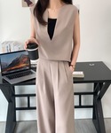ノースリーブブラウス&ワイドパンツのお得な2点セットが登場! 通勤やちょっとしたお出かけ・お食事会まで幅広く活躍します。 上品見えする落ち感がある生地を使用し様々なシーンに対応できる着まし力抜群のセットアップ。 ブラウスは深めのV開きなのでインナーにカットソーやハイネックニットを重ねて、 今年らしいレイヤードスタイルを楽しんで頂けます。 パンツはボディラインを拾わないストンと落ちるストレートワイドシルエット。 ハイウエストデザインでスタイルアップが叶うウエストタックデザインの上品な美脚効果。 セットでの着用はもちろん、お手持ちのアイテムと合わせて単品使いもOK。 小物を変えるだけで行事ごとのコーディネートが楽しめます。