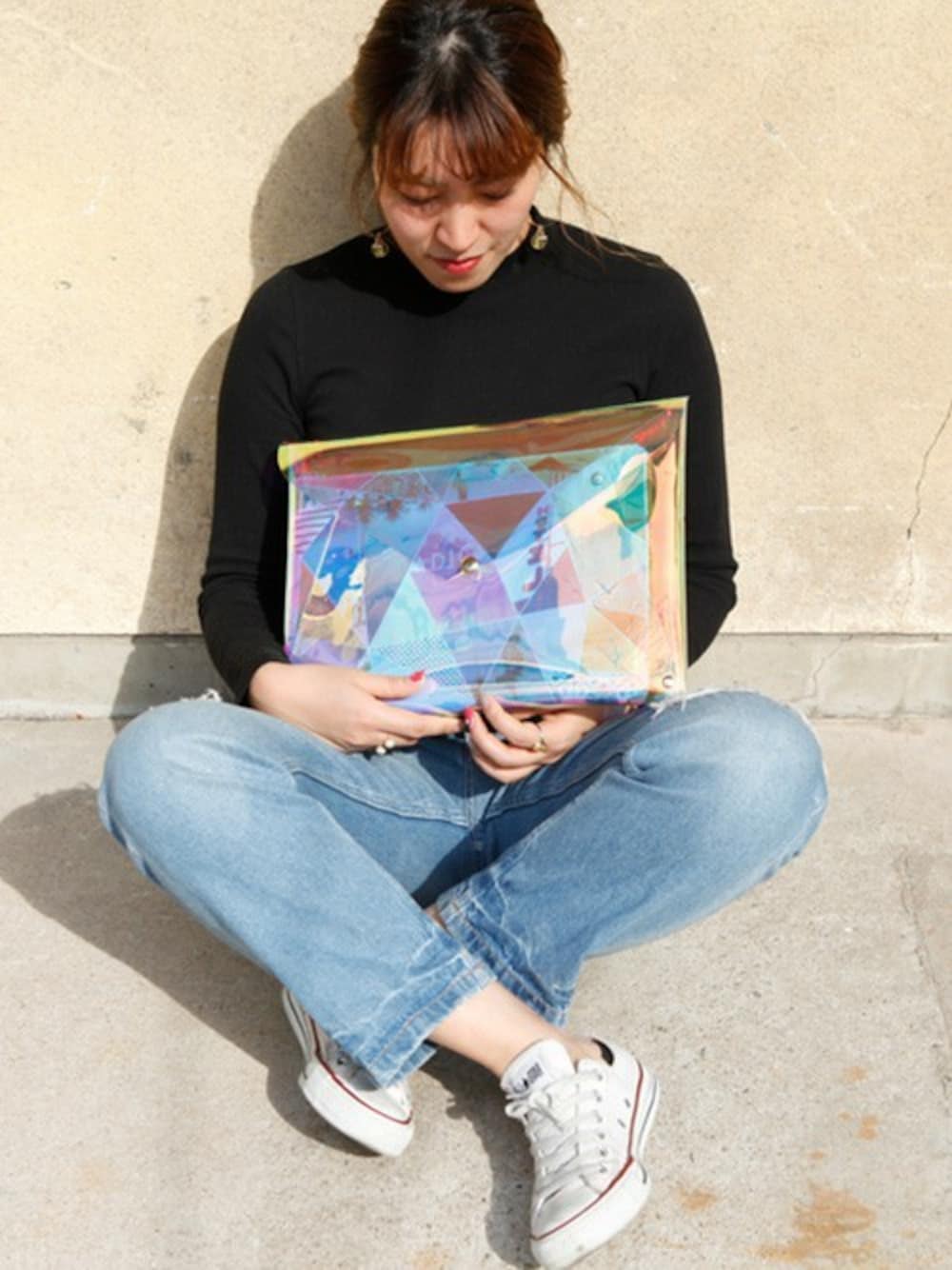ACCOMMODEのクラッチバッグ「トリップコラージュクリアクラッチ」を使ったコーディネート