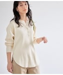 襟元のスナップボタンがワンポイントのトップスに グリーンのカラーパンツを合わせた、 大人カジュアルスタイルです。