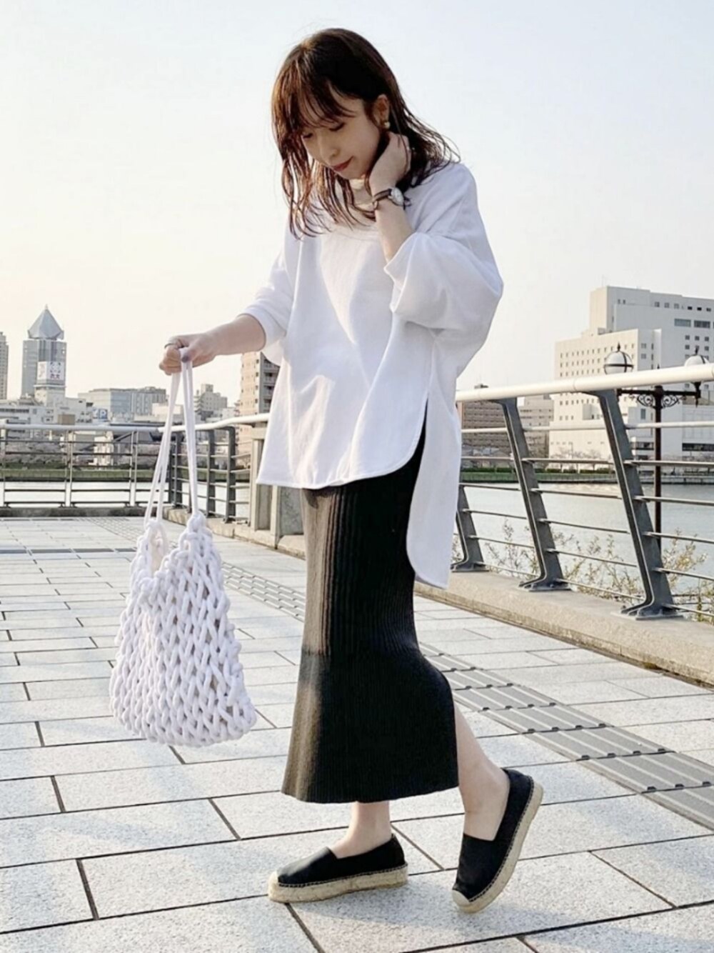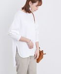 オーバーサイズで着心地も良く、前後差のあるディテールが様になるトップスに、LIVのタイトスカートを合わせた、大人のリラックスカジュアルコーデです。 STAFF:152cm