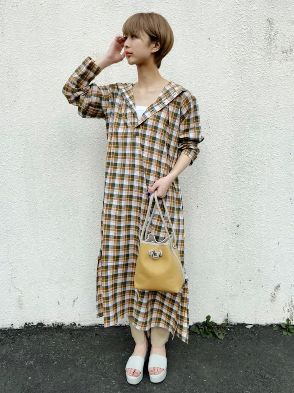 チェック柄のワンピース主翼に、同系色でまとめたカジュアルコーデです。 明るいカラーを身に付けると気分も高められるので、お気に入りのワンピースがあるととても便利です◎ STAFF:164cm