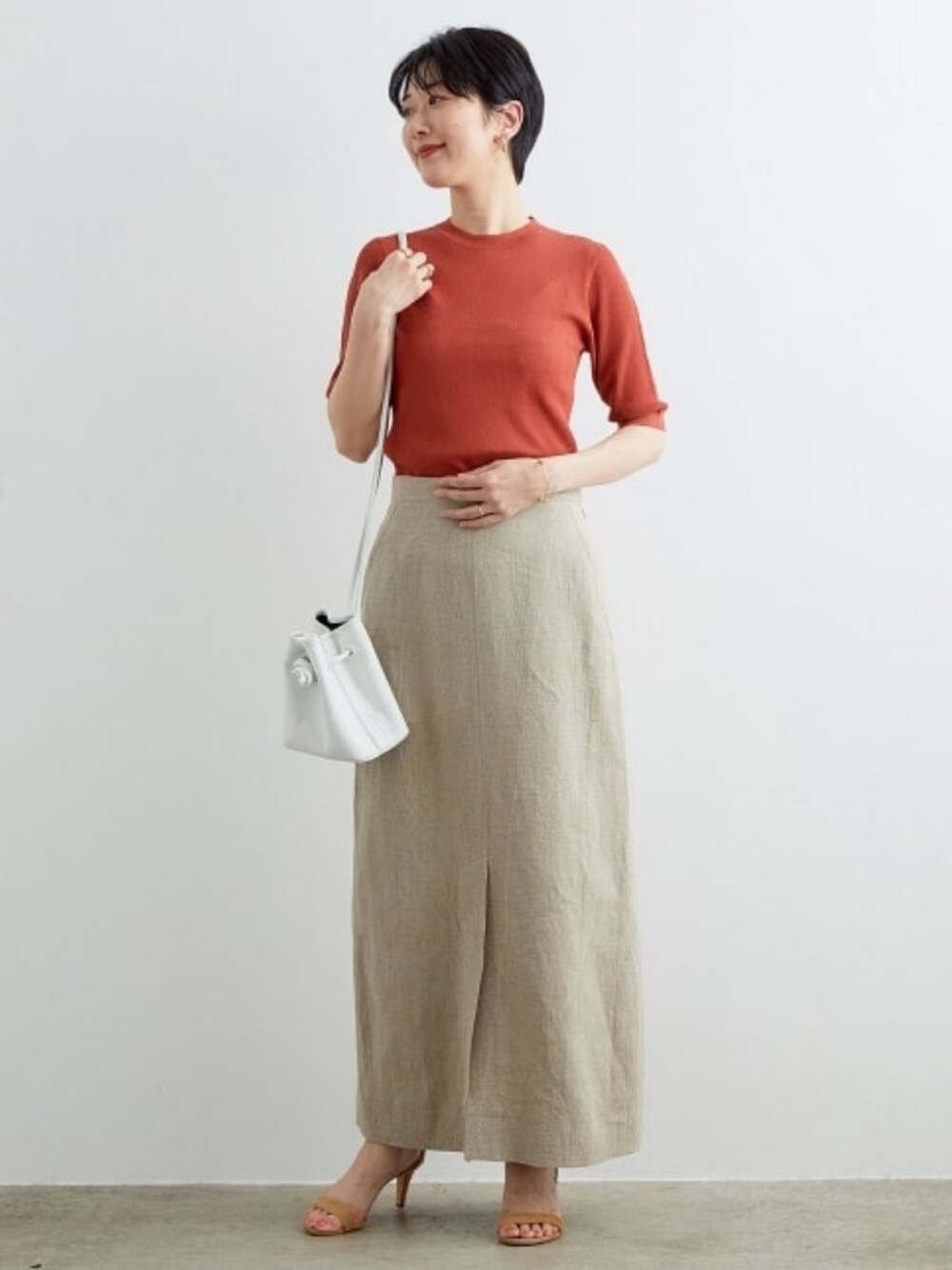 上品な透け感がすてきな細身のリブトップスに、ロングスカートを合わせたスタイルです。 トップスに程よいフィット感があるので、スカートのシルエットが活きるバランスになっています◎ STAFF:160cm
