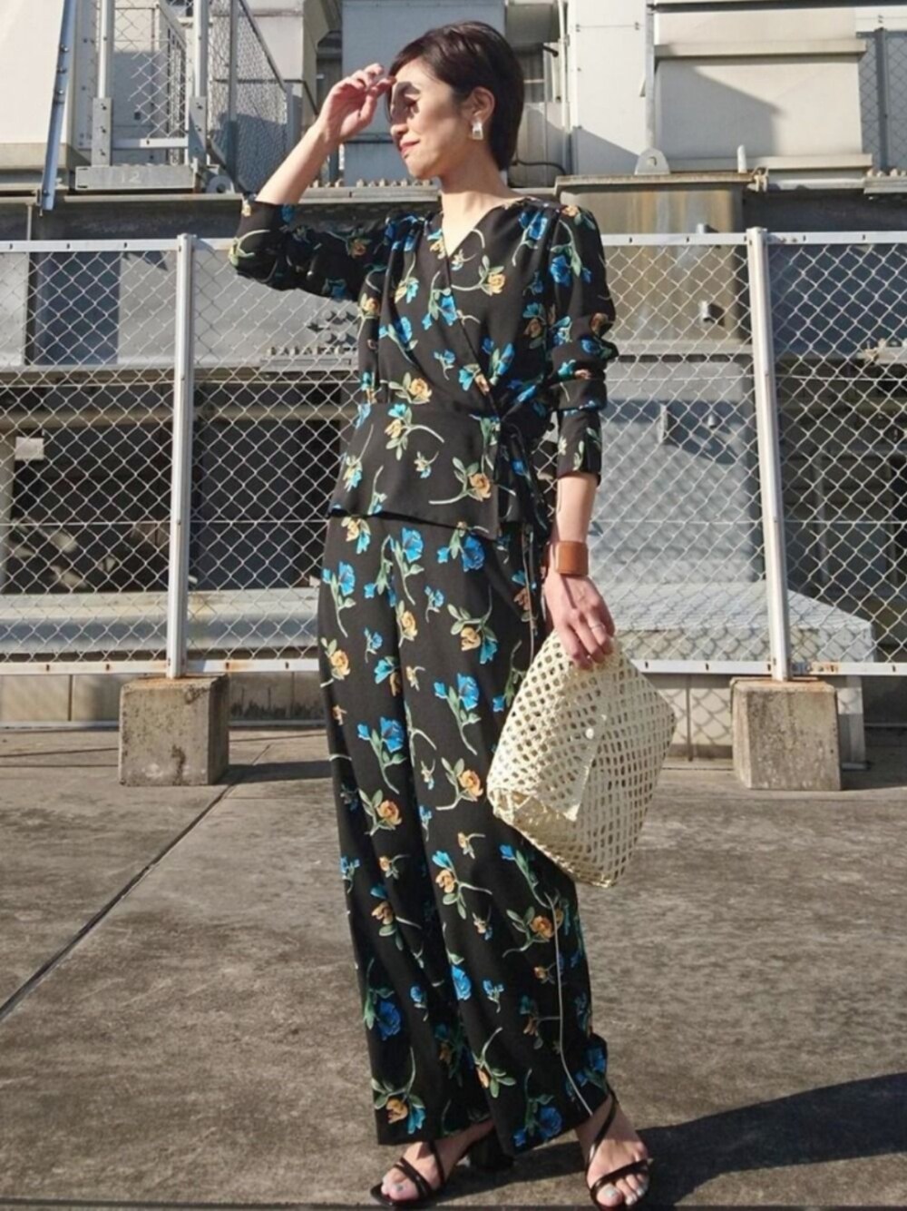 カシュクールブラウスとワイドパンツのセットアップです。リラックスシルエットながら、黒地ベースなので大人の雰囲気が漂います。 サンダルと合わせて抜け感を出すのが、これからの季節にはおすすめです◎ STAFF:157cm
