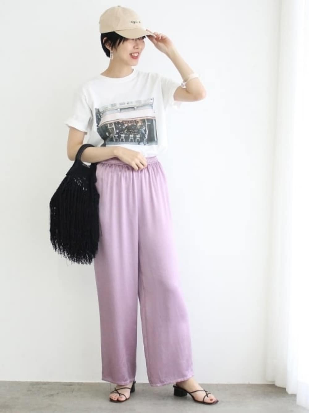 大人カジュアルには欠かせないフォトプリントのTシャツを、ワイドなカラーパンツでルーズに合わせたリラックスコーデです。 フォトTは、羽織りアイテムのインナーとしても活躍してくれるので、1枚持っていると便利なアイテムです。 STAFF:167cm