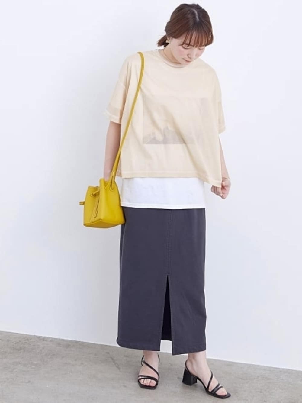 シアー感のあるニットトップスを、フォトTシャツにレイヤードした大人カジュアルコーデです。 スカートはロング丈ですが、スリットが入っていることで軽やかで女性らしい印象に◎ STAFF:158cm