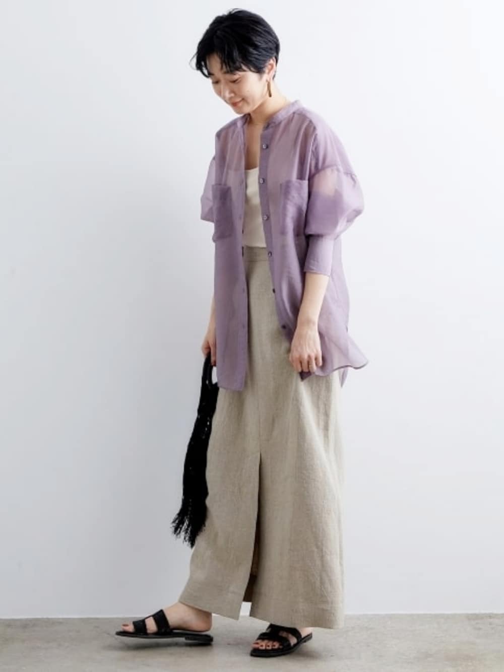シアーシャツとロングスカートで日差しよけをしながら、足元のサンダルで抜け感を演出した大人のカジュアルコーデです。 真夏には、トップスをノースリーブにしてシャツを腰巻きするのも素敵です◎ STAFF:160cm