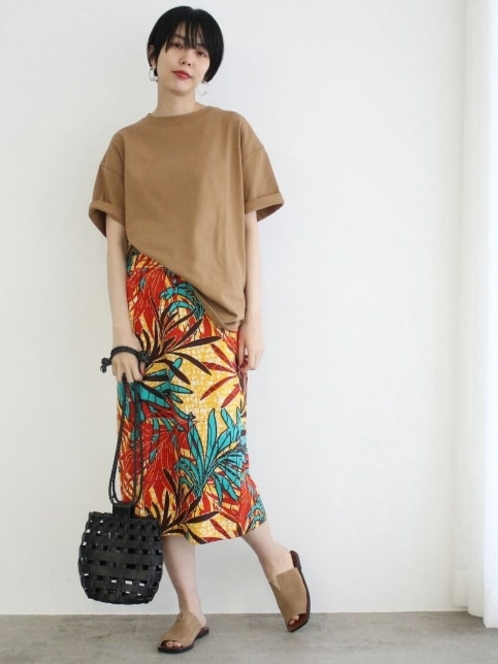 トレンドのアフリカンムードを、大胆な柄がプリントされたスカートで演出したコーディネートです。 スカートがすっきりとしたタイトシルエットなので、ルーズなトップスをあわせると、こなれた印象に◎ STAFF:167cm