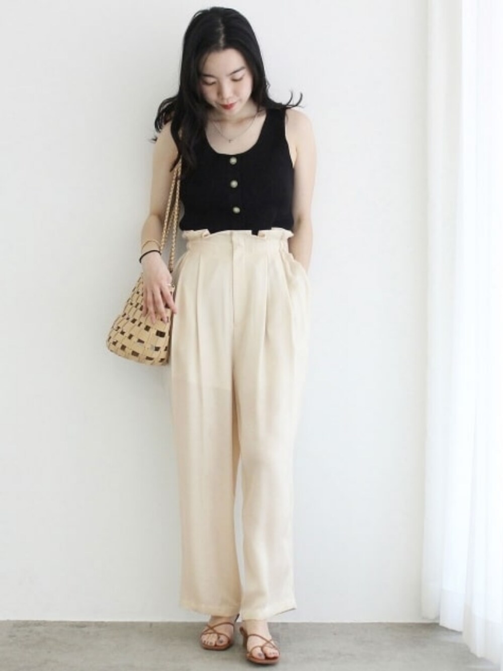 ハイウエストデザイン&とろみのある素材感で、夏に向けて活躍間違いなしのおすすめパンツコーデです。 腰まわりのボリュームが抑えられているので、程よいリラックス感がありながらも、すっきり見えするシルエットが魅力。トップスをインすると、スタイルアップ効果も◎ STAFF:162cm