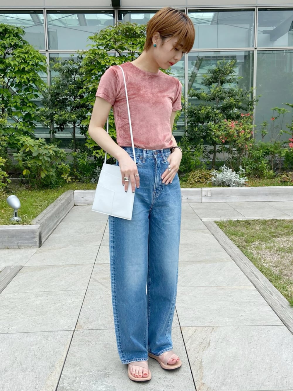 夏の定番といえばTシャツ×デニム。ベロア素材のTシャツをチョイスして、強まるカジュアル感をやわらげたスタイルです。 コンパクトトップスは、ハイウエストデニムとのバランスが◎。定番だからこそ、素材やバランスにこだわって◎ STAFF:164cm