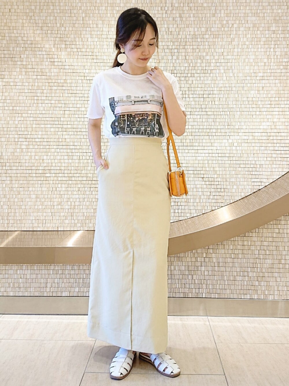 今季マストバイなフォトTシャツに、ロングスカートを合わせた涼しげな大人カジュアルコーデです。 スカートがやさしいイエロー寄りのベージュカラーなので、カジュアルなアイテムながら、女性らしい印象にまとまります。 STAFF:162cm