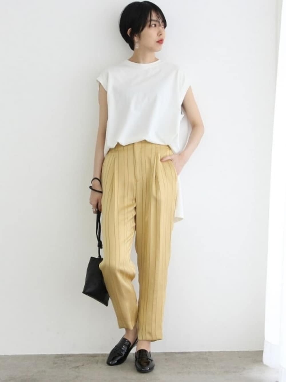 イエローのパンツが主役になるよう、その他を白黒で合わせました。Tシャツは、前だけインすることでこなれた印象に。 履いているシューズは、実はレインシューズ。ポーチ付きなので持ち歩きにも便利です◎ STAFF:167cm