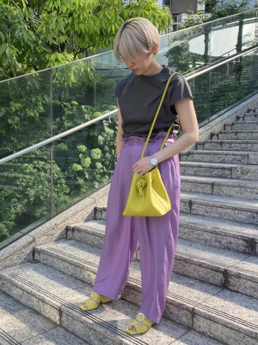 夏の気分が高まる、カラーの組み合わせを楽しんだコーディネートです。 シンプルなTシャツも、カラーパンツやカラー小物を合わせるだけで、一気に華やかな印象に仕上がります◎ STAFF:163cm