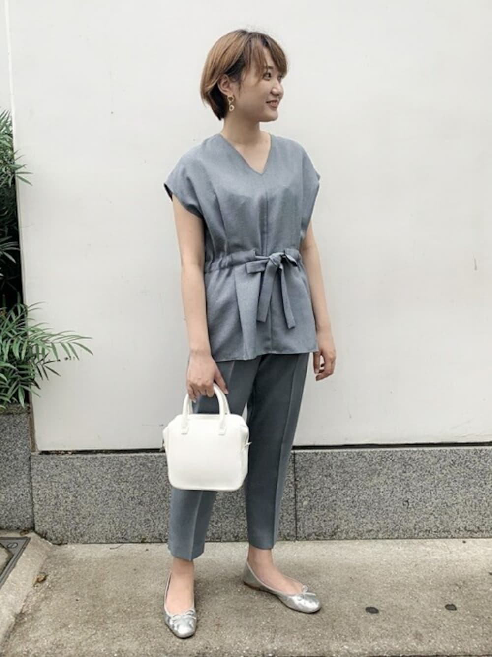 ダスティなグリーンのセットアップを、ホワイトやシルバーの小物で合わせた涼しげなコーディネートです。 リネンのように見えてポリエステルなので、ご自宅で洗えるという点は、この時期最大の魅力◎しわにもなりにくいのでとても扱いやすいアイテムです。 STAFF:162cm