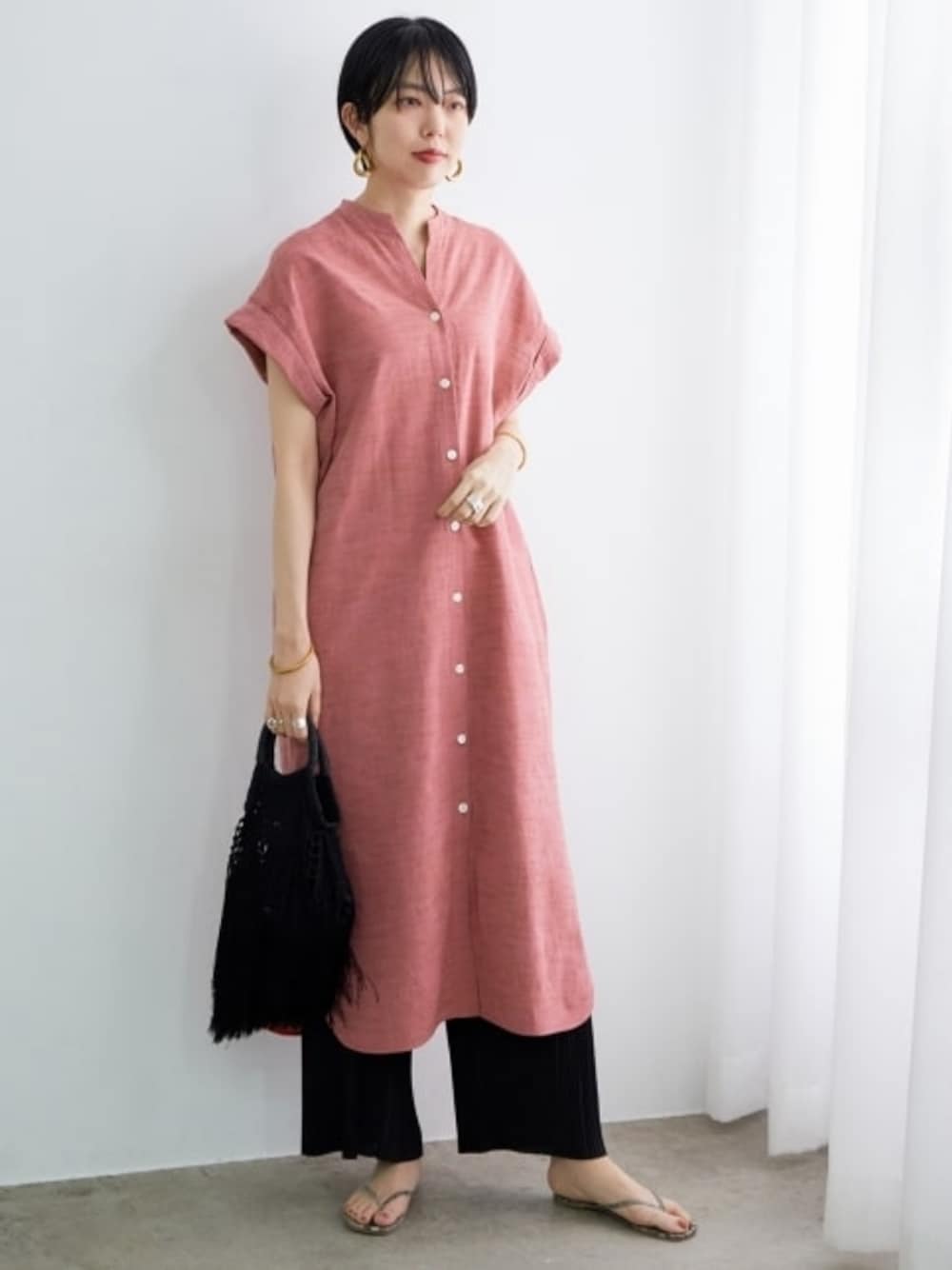 ロングシャツワンピースにパンツをレイヤードし、サンダルで抜け感をだしたリラックスコーデです。 ワンピースのカラーが主役になるように、パンツや小物は色をおさえました。羽織っても素敵に着ていただけます。同素材のパンツと合わせたセットアップコーデもおすすめです◎ STAFF:167cm