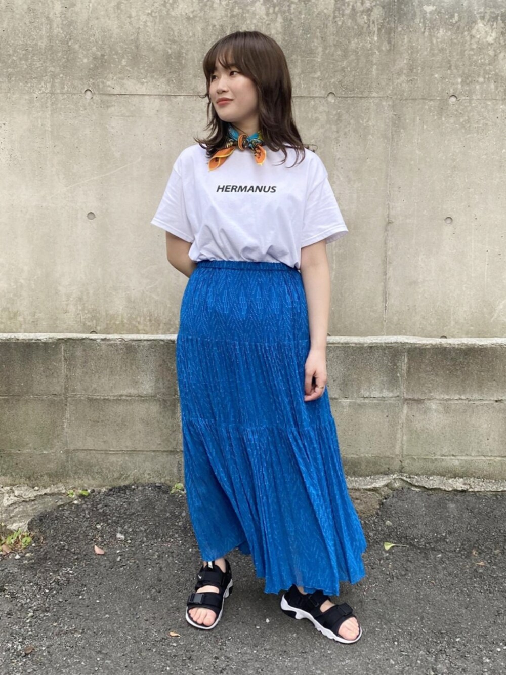 足元にシアー感のあるロングスカートのブルーを主役に、ロゴTでカジュアルに合わせたコーディネートです。 ロゴTシャツとセットになっているバンダナスカーフをアクセントに、スポーツミックスに仕上げました。 STAFF:158cm