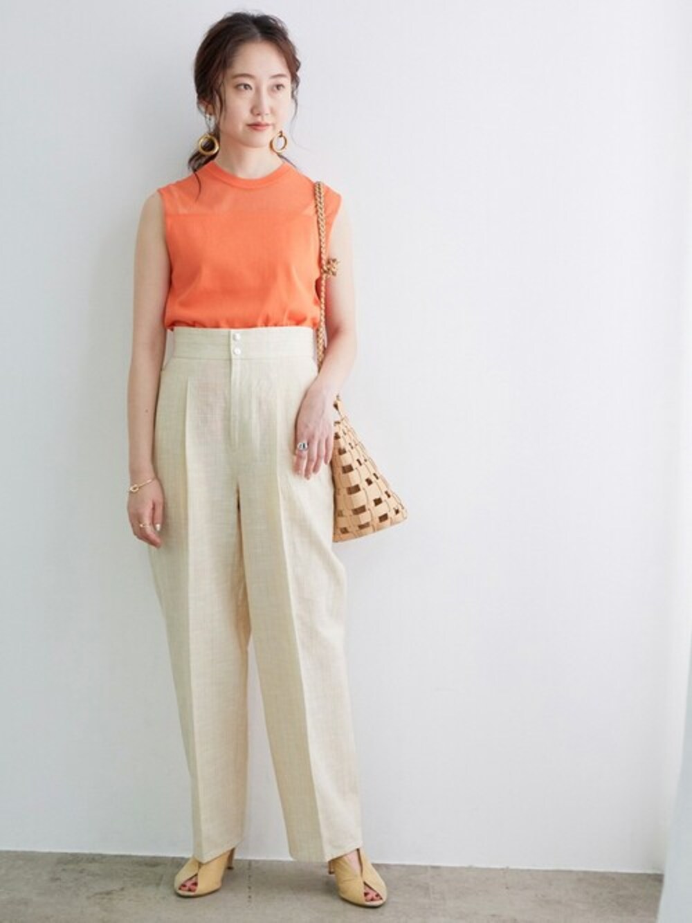 ビタミンカラーでもあるオレンジをメインに、小物をワントーンでまとめた夏の大人コーデです。 デコルテ部分に透け感のある女性らしいデザインのトップスに、ハンサムなパンツを合わせることで、甘すぎずかたすぎないコーディネートにまとまります◎ STAFF:157cm