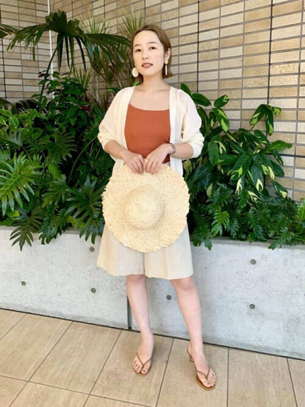 ゆったりとしたデザインのカーディガンをさらっと羽織った夏のコーディネートです。 オフホワイトとベージュでまとめつつ、ポイントにキャメルカラーを差し色にしたことで、女性らしいカジュアルコーデに仕上がりました◎ STTAFF:163cm