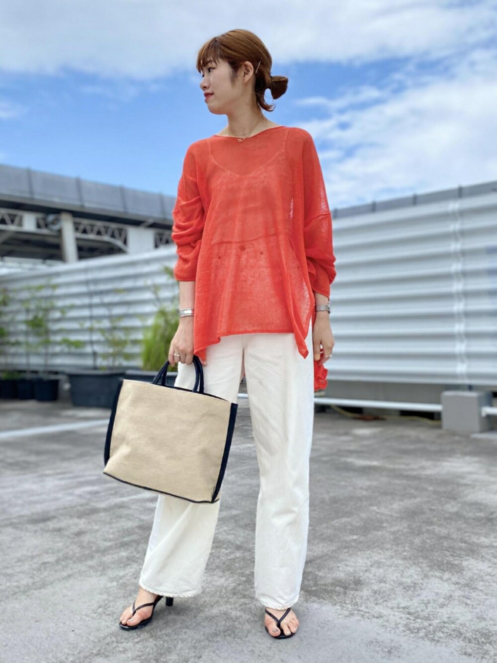鮮やかなオレンジが、夏の空に映えるコーディネートです。 ボトムにホワイトのパンツを合わせてシンプルにすることで、ニットのリネン特有の風合いや透け感を引き立たせました。 STAFF:168cm