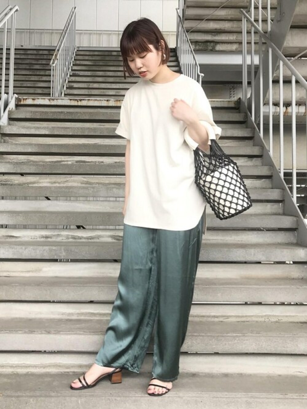 毎年ご好評いただいているBIGTeeに、グリーンの光沢が素敵なサテンパンツを合わせました。 こちらのパンツは、弊社のワイン工場で、ワインを作る際の残渣を使用している、サスティナブルなアイテムです◎ STAFF:164cm