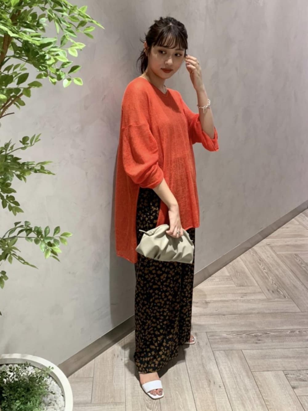 鮮やかカラー × シックな柄の掛け合わせスタイルです。 ゆるいシルエットのトップスにワイドパンツを合わせるときには、とろみ感のある素材がおすすめです。 STAFF:161cm