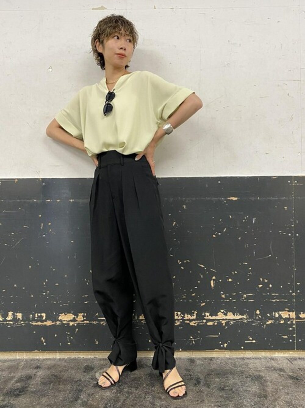 足元のボタンでメリハリのあるアレンジができる、素敵なパンツのコーディネートです。 トップスには、コンパクトなTシャツなどはもちろん、インして着ていただくのもおすすめです。 STAFF:164cm
