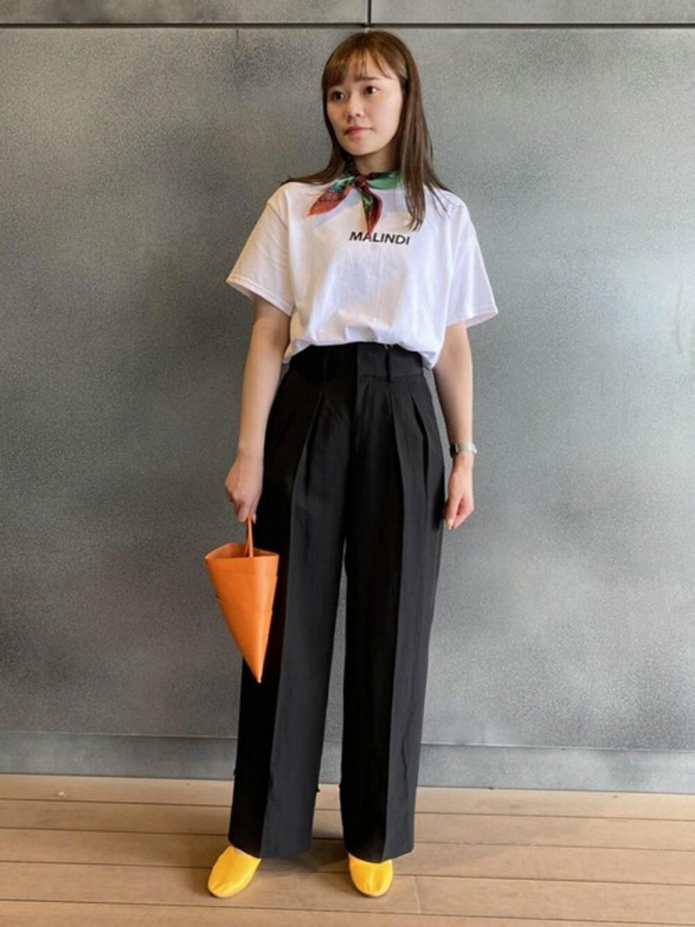裾のボタンを留めてシルエットを変えることができる、2WAY仕様のスラックスとロゴTを合わせたコーデです。 Tシャツは、バンダナとトートバッグがSETになっています。 STAFF:160cm