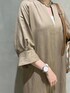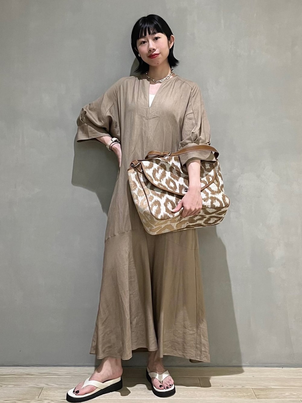 ロングワンピースは、アクセントになるバッグを合わせるのと、サンダルで足元に抜け感を出すのが好バランスのポイントです。さらりと一枚で着こなして、リネンならではの風合いを楽しんでみてください。 osari 165cm 心斎橋パルコ